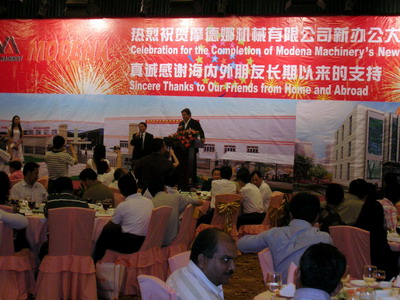 摩德娜公司“新辦公大樓落成”慶典答謝酒會(huì),日前在佛山賓館舉行。出席酒會(huì)的有來(lái)自世界各地的供應(yīng)商代表們、媒體代表們等400余人。為滿足現(xiàn)場(chǎng)眾多國(guó)外來(lái)賓的需求,發(fā)言現(xiàn)場(chǎng)特別采用了中英文進(jìn)行直接翻譯;其中,摩德娜公司總經(jīng)理管火金先生現(xiàn)場(chǎng)翻譯意大利語(yǔ)的場(chǎng)景尤為壯觀。