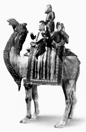 唐三彩作品中造型最為生動(dòng)的是駿馬,最具代表性的是葬于723年的鮮于庭誨墓中出土的兩組4件三彩馬。它們的體高都超過50厘米,兩匹毛色純白,另兩匹是頸部帶有白斑紋的白蹄黃馬。4匹馬造型都極生動(dòng),長頸肥軀,體骨勻稱,馬尾結(jié)扎成彎角形狀,馬具鮮明、轡和鞍、鞦的革帶上都飾著漂亮的黃金花和杏葉。一對(duì)白馬的長鬃剪出當(dāng)時(shí)流行的“三花”飾,另一對(duì)白蹄黃馬只將馬鬃剪出一花。鮮于庭誨墓中還出土了一件極為罕見的駱駝?shì)d樂俑,在駱駝背馱載的平臺(tái)上,塑出四人樂隊(duì)和一名起舞的綠衣胡人男子。駱駝造型雄健優(yōu)美,樂俑、舞俑形象生動(dòng)。