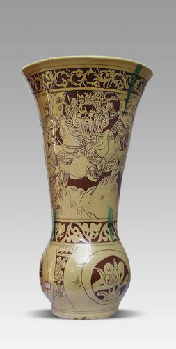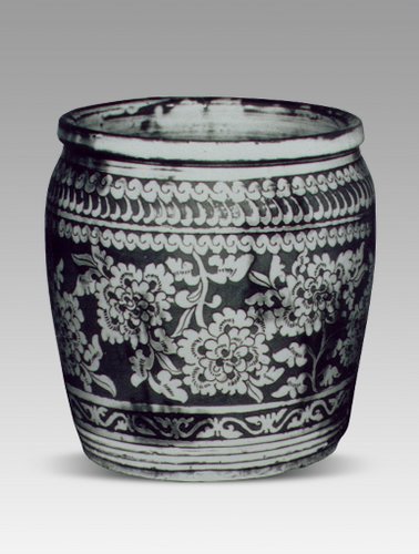 界首彩陶采用的陶土是取自當?shù)氐狞S膠泥,窯工又稱之為“黃河淤”,即黃河泛濫后沉積下來的黃色粘土。據(jù)《元史·河渠志》記載,黃河泛濫影響潁河是在元仁宗延年間(1314~1320年)。當?shù)馗G工介紹,黃膠泥又有大、小膠泥之分,黃河泛濫之前的粘土稱為小膠泥,其性硬,只能做盆、盤、盞等造型簡單的陶器;黃河泛濫以后波及到的地方,沉積的粘土稱為大膠泥,其性軟,可塑性較強,能制作造型較為復雜的陶器(圖6、7)。元代以后,界首彩陶吸收了當?shù)乇容^盛行的木版年畫和剪紙貼花的裝飾技法和紋飾內(nèi)容,出現(xiàn)了刻畫、剔花工藝,初步形成了自己特有的藝術風格(圖8、9)。在清晚期至民國時期,界首彩陶在繼承前期制陶技藝的基礎上,又受到當時戲曲藝術的影響,紋飾內(nèi)容更加豐富多彩,除了花鳥魚蟲外,出現(xiàn)了大量以傳統(tǒng)劇目為題材的人物場景畫,刻劃、剔花裝飾工藝更為普遍(圖10)。建國初期,界首彩陶得到政府的關心和支持,著名窯工盧山義、盧山志被送往中央美院華東分院群眾藝術研究班學習,使得他們的繪畫、制坯水平得到很大提高。1954年,盧山義先生組建了陶器生產(chǎn)合作社,1958年改名為界首工藝陶瓷廠。1954年,蘇聯(lián)東方藝術博物館《造型藝術》刊登了盧山義先生制作的三彩“刀馬人”酒壇的照片,在國際上反響很大,東歐地區(qū)的一些國家爭相收藏其作品,盧山義先生也被中國民間藝術家協(xié)會評為全國優(yōu)秀民間藝人,與紫砂藝人顧景舟等大師齊名。“文革”后期至20世紀80年代初期,我國文化藝術重獲新生,界首彩陶也迎來了一個藝術的春天。界首工藝陶瓷廠在著名工藝美術家韓美林先生的指導下,研制出硅硼系列彩釉,如烏金釉、金砂釉、孔雀藍釉、玫瑰紅釉等,代替了原來的鉛釉,同時把陶器由低溫型轉為高溫型(窯溫達1000℃左右),胎釉結合較前更為緊密,彩釉更加艷美,產(chǎn)品遠銷東歐、美國、日本、香港等國家和地區(qū)。盧山義先生的“三彩刻花缸”(圖11)還于1984年獲輕工部中國工藝美術品百花獎優(yōu)質(zhì)產(chǎn)品獎。
