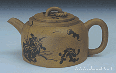 在紫砂傳世品中,有少數(shù)題款“雍正”、“乾隆年制”、“貢局”所制官府定燒器,以其精巧雅致而備受青睞。(圖二)這件雍正年造團(tuán)砂泥繪井欄壺就是這類器具典型。泥繪裝飾,流行清初,是一種在紫砂坯體上裝飾方法。即在已完工尚有一定濕度的泥坯上,用其他色泥或本色泥料堆畫(huà)山水、花鳥(niǎo),泥料畫(huà)出有一定厚度恰似薄雕效果。色泥有烏泥、朱砂泥、白泥等。此壺用烏泥繪竹、菊、蝙蝠。筆意跳躍富朝氣。橋形鈕內(nèi)扣繩紋環(huán),小巧可愛(ài)。壺蓋為平嵌蓋,達(dá)到“準(zhǔn)縫無(wú)紙發(fā)之隙”水平。壺身弧度與橋鈕弧度一致,體現(xiàn)了對(duì)稱性。壺把向外回轉(zhuǎn)得大了些與嘴的長(zhǎng)度契合,求視覺(jué)上調(diào)和。匠師充分利用紫砂泥特有肌理質(zhì)感,與樸素玄妙烏泥對(duì)比,恰如其分的裝飾,達(dá)到含蓄而提神醒目的藝術(shù)表現(xiàn)力。底款篆書(shū)“大清雍正年制”,可見(jiàn)顯然是由官府指定裝飾,交付宜興“貢局”燒造,然后奉貢皇室使用,故而彌足珍貴。