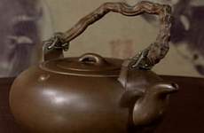 王敬之:那么后來拉收藏它這個(gè)人哪,它的這個(gè)人哪,我覺得是一個(gè)呢,很有藝術(shù)氣質(zhì)的人。所以他在搞這么一個(gè)藤,一個(gè)枯藤放在這個(gè)的時(shí)候,我覺得是錦上添花,做的非常好。它這個(gè)蓋呀,我們來看它的這個(gè)蓋呀。這個(gè)蓋來說,一般像這這么大的壺,蓋子小了不好看,它在做這個(gè)壺的時(shí)候,把它成一個(gè)假蓋,這樣看起來好像這么一個(gè)蓋,實(shí)際上這個(gè)蓋不是蓋。是蓋的外延。但是看起來就好像是一個(gè)蓋。所以這把壺啊,頗具匠心。這個(gè)是軟提梁壺,它做的是兩個(gè)鐵的,它這兩個(gè)高的圓點(diǎn)呢,就是讓人在拿壺的時(shí)候啊方便,方便拿起來,不要用手來摳。 原先的主人啊,非常非常愛這把壺,它是有使用痕跡,我們可以看出來,它這地方都留有使用的痕跡,這都是使用痕跡。但是壺里邊非常干凈,這只有一個(gè)解釋,就是每次他喝完茶,喝完了之后啊,他都會(huì)仔細(xì)地把這把壺好好洗一洗。這把壺真是一把好壺。
