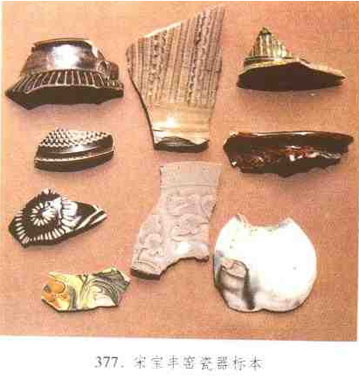 宋、金時期瓷窯,在寶豐清涼寺。燒瓷品種有青釉、白釉、黑釉、綠釉、醬釉、三彩、鈞釉等。青瓷質(zhì)量較好,造型、紋飾與耀州窯近似,青釉印花碗較多、紋飾主要有纏校菊紋、菊瓣紋、海水魚紋、海水螺紋、蓮紋、分格折枝花紋等,還有其他窯所未見的海水船紋。刻花裝飾見于盤、瓶、器蓋、碗上,有刻線紋、刻菊瓣紋。劃花裝飾有花卉、劃花間篦劃紋。青釉光素器物中的厚唇小足小碗,與耀州、臨汝窯青釉小碗很相似。還有的碗內(nèi)飾5至6條線紋裝飾,這類碗在耀州、臨汝等窯也很常見。此外光素器物還有器蓋、雙耳罐等。白釉器物有黑口碗、雙耳罐、瓜棱罐、珍珠地劃花瓶、篦劃水波紋瓶、柳斗杯。黑釉器物有線紋罐,醬色花紋器物有瓶、雙系瓶、罐、六角紋盤(有的里心有褐色點(diǎn)彩)等。黑釉戳麥粒紋裝飾在北方其他窯中比較少見。醬釉碗有的為外醬釉、內(nèi)醬口白釉。綠釉器有水波紋、篦點(diǎn)紋枕、梅花式盒、爐。三彩器有腰圓、八方枕、此外還有赭黃色劃花腰圓忱。鈞釉標(biāo)本較少,主要器形為碗。(見圖377)