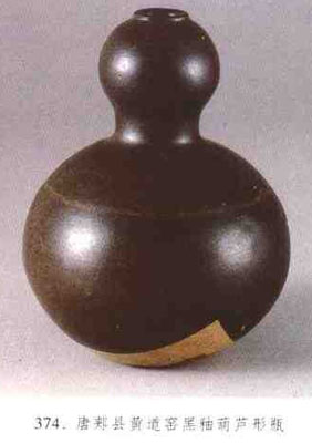 唐至元代瓷窯。窯址在郟縣,已發(fā)現(xiàn)黃道、黑虎洞、石灣河3處遺址。黃道、黑虎洞均發(fā)現(xiàn)唐至元代標本,石灣河僅發(fā)現(xiàn)元代標本。唐代遺物有黑釉斑點花瓷和黃釉品種;稍晚一些有白釉綠彩器,白釉略微泛黃,綠彩呈碧綠色,此品種在河北、河南、山東、陜西、安徽的10余處瓷窯中,以郟縣窯所產色彩最美。元代遺物有磁州窯風格的白地黑花、鈞釉器物。白地黑花四系瓶,與禹縣扒村窯的一樣,上半部白釉,以褐彩書“春夏秋冬”4字,下半部施褐釉。宋代北方流行的五角或六角盤,郟縣窯亦有燒制,釉為褐釉,釉下施白色化妝土,盤里心為五角形露胎,是為疊燒而形成的—種裝飾方法。(見圖374)