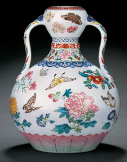 圖片說(shuō)明:清乾隆粉彩花蝶紋如意耳葫蘆尊
