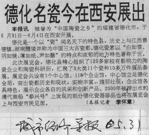 本報訊 被譽為“中國陶瓷之鄉(xiāng)”的福建省德化市,于 5月31日一6月4日在西安開展。