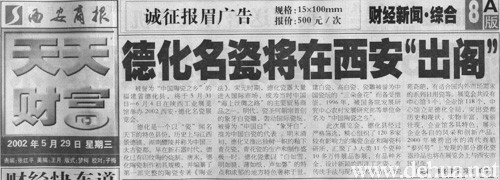 被譽為“中國陶瓷之鄉(xiāng)”的福建省德化縣,將于5月31曰一6月4日在陜西工業(yè)展覽館舉辦2002西安-德化名瓷展覽會。