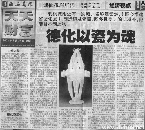 據(jù)傳刺桐城西,戴云大麋,有個(gè)瓷雕大師沉迷十載,精心制作了一支奇特的瓷洞簫。此簫吹奏,東邊來(lái)龍西邊來(lái)鳳,南邊魚(yú)蝦跳躍,北邊百鳥(niǎo)來(lái)儀。一吹風(fēng)調(diào)雨順,二吹五谷豐登,三吹萬(wàn)民康樂(lè),四吹天下太平。此后,東邊多了座龍潯山,西邊有了鳳凰山,南邊魚(yú)蝦戲水,北邊百鳥(niǎo)飛翔。龍潯山下,完民聚集成一小城,其各德化。德化的山民們撮土為瓷,以瓷為業(yè),生生不息,遂成瓷都。千百年來(lái),龍潯山演繹著一個(gè)個(gè)有關(guān)瓷的傳奇。近十年間,瓷都德化人譜寫(xiě)了一首蜚聲中外的瓷之歌。