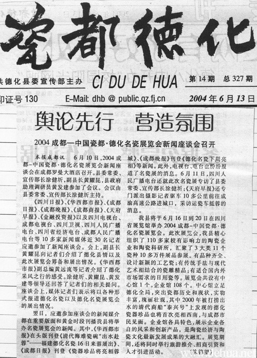 翌日,應(yīng)邀參加座談會的新聞媒介都在重要版面和黃金時(shí)段刊播我縣將舉辦名瓷展覽會的新聞。其中,《華西都市報(bào)》在頭版刊登《清代海難瓷碗“出水赴蓉”——福建德化名瓷16日來蓉展出》、《成都日報(bào)》刊登《瓷器珍品將亮相蓉城》、《成都晚報(bào)》刊登《德化名瓷下周亮相》等新聞。此外,電視臺、電臺也紛紛報(bào)道了名瓷展的消息。6月11日,四川人民廣播電臺還就此次名瓷展專訪了縣委常委、宣傳部長涂健圻;《天府早報(bào)》還專門派出攝影記者驅(qū)車10多公里前往成渝高速公路進(jìn)城口,采訪運(yùn)瓷車抵蓉的消息。