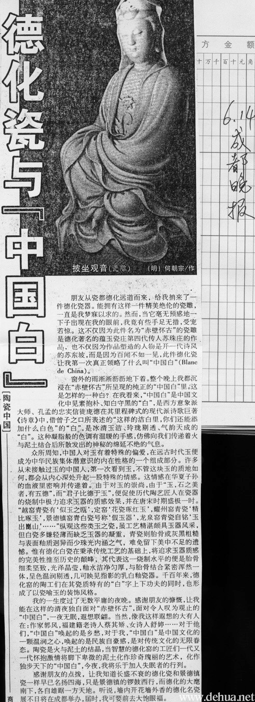 感謝朋友的點撥,讓我知道長盛不衰的德化瓷和景德鎮(zhèn)瓷一樣早已名揚四海,只是景德鎮(zhèn)的鑼鼓西行,而德化的大麾南下,各自雄踞一方天地。聽說,墻內(nèi)開花墻外香的德化名瓷展不日將在成都舉辦,屆時,我可要前去大飽眼福。