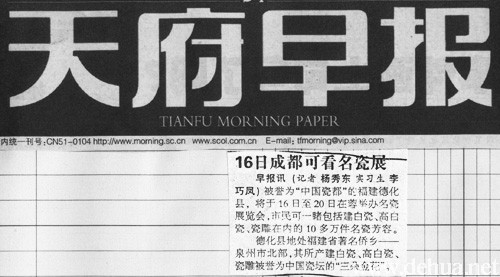 早報(bào)訊(記者 楊秀東 實(shí)習(xí)生 李巧鳳)被譽(yù)為“中國瓷都”的福建德化縣,將于16日至20日在蓉舉辦名瓷展覽會(huì),市民可一睹包括建白瓷、高白瓷、瓷雕在內(nèi)的10多萬件名瓷芳容。
