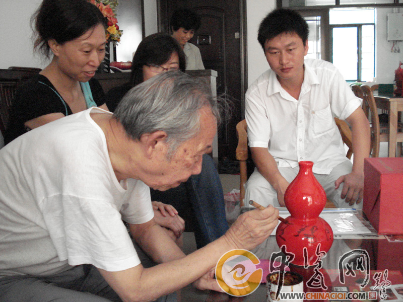 8月3日,中國工藝美術(shù)大師王錫良在《和諧中華迎奧運》禮品中國紅葫蘆“福祿平”上簽名。