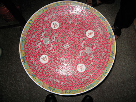 “其實當(dāng)時這種瓷器絕大多數(shù)是用來出口的。國內(nèi)老百姓能夠買到的一般是‘出口轉(zhuǎn)內(nèi)銷’瓷。這件直徑50.8厘米的瓷盤也是如此。這批退回內(nèi)銷的瓷器雖然有一些小毛病,但還是很精致的。”江西省收藏家協(xié)會文革瓷收藏專家張先生說。