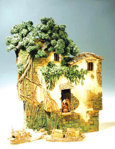 “心存青山綠水,手捏春夏秋冬”,牽陶藝鄉(xiāng)土情,系嶺南山水韻是新美陶公司當代青年陶藝家楊慶火昆、區(qū)錠鸞伉儷的陶藝作品寫照。他倆都是石灣人,自小青梅竹馬,有共同的喜愛和志向。楊慶火昆在中學時期,已顯示出在山水畫方面的天賦,參加工作后又從事瓷片繪畫十多年。進入陶藝創(chuàng)作室之后,他倆常常探索,如何把自己所學長處發(fā)揮到陶藝創(chuàng)作中去,于是勇于開拓進取的他們以畫入陶,把中國畫融匯于陶塑器物之中,開創(chuàng)了立體山水陶塑之路。