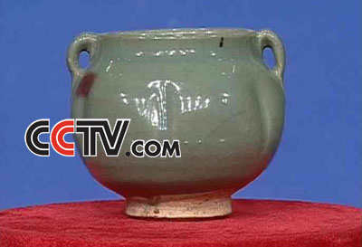 藏品特征:這件藏品為一個(gè)瓜棱雙耳罐,通高為厘米,口沿直徑10厘米,腹徑14厘米,底足直徑6.5厘米,底足無釉無款。左側(cè)有一塊紅色的斑,罐的內(nèi)外均施釉,釉色為灰蘭色,品相完好。