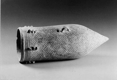 在我們發(fā)現(xiàn)這個(gè)尖底紅陶瓶時(shí),里面有幼小的人類尸骨。這件器物除實(shí)用外,口沿處蓋一鼎或盆可做葬具,這就是當(dāng)時(shí)流行的甕棺葬。據(jù)說,夭折的嬰孩放在此瓶中,埋在父母住處的房基下,寓意骨肉不分離,瓶身上的圓孔用來供靈魂自由出入。