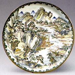 此對盤為敞口,淺弧壁,圈足,底畫琺瑯彩折枝天生作款,銅胎沉重,口沿與足底鏨金,盤內口沿以黃、綠、藍彩繪制孔雀羽毛作裝飾,盤心畫白地遠山近水、亭臺樓閣、拱橋寶塔、魚船行旅等,筆致精細,仿佛將中國山水畫的題材盡收其中,盤外壁畫黃地纏枝花卉紋,是清代出口銅胎畫琺瑯的代表作品。"折枝天竺"圖案款。