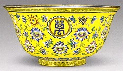 此碗為銅質,上畫琺瑯 "萬壽無疆"四宇和八寶紋圖,紋飾精美足,為清代畫琺瑯器中的佳品。
