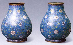 掐絲琺瑯器與鏨胎琺瑯器的表面效果相似,都給人一種似寶石鑲嵌的感覺。這其中的主要原因是,掐絲琺瑯器和塹胎琺瑯器二者在點藍(填施琺瑯釉)、焙燒、磨光和鍍金等工藝制作方法上基本是相同的。二者之間的根本區(qū)別在于金屬加工工藝的具體方法上,即圖案紋樣的起線(制作和形成)方法。掐絲琺瑯器是以細而薄的金屬絲或金屬片,焊著或者是粘合在金屬胎上組成圖案紋樣;而塹胎琺瑯器則是運用金屬鏨刻技法起線花紋。因此,如果我們細心觀察這兩種琺瑯器,就會發(fā)現(xiàn),掐絲琺瑯器的圖案線條纖細而婉轉(zhuǎn),而且在掐絲、焊著及磨光的過程中,比較容易產(chǎn)生線條斷裂現(xiàn)象而塹胎琺瑯器的圖案線條一般比較粗壯,且無接頭相焊痕。