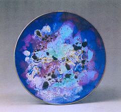 在釉色上,采用新的配料,燒制出以前沒(méi)有的顏色,使鈞瓷的色彩更加斑斕。有一件極品掛盤(pán),上面呈現(xiàn)出七八種色彩,盤(pán)折曲繞,互相映襯,精美至極。