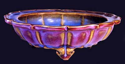 鈞窯瓷器的胎色灰白淺黃,底刷漿釉,釉色有天青、月白、灰藍、海棠紅、玫瑰紫等色,出色的作品乃天青與玫瑰紫、海棠紅交接在一起,給人以變幻無窮的色彩美。不少人往往借用唐人詩句:“夕陽紫翠忽成風(fēng)”來形容它,可謂一點也不過分。故宮博物院收藏的“宋鈞窯尊”,其口緣內(nèi)施天青釉,器外則以大青、玫瑰紫和海棠紅交融在一起,釉色美如朝暉晚霞,極盡絢麗璀璨之致。其實,鈞窯瓷器就其瓷釉的基調(diào)來說,是濃淡不一、幽雅的天青色,而所謂到窯瓷器有月白、灰藍之色,也只是色度上的差異而已。因此,鈞窯瓷器仍屬于青瓷系統(tǒng),而像此尊上所閃現(xiàn)的海棠紅色是加入銅的成份所致。銅紅的燒成難度較大,銅的含量多少,會影響到呈色的效果。此外,銅紅對窯溫和燒成氣氛也十分敏感,它必須以還原焰在 1250℃ 以上的高溫下,而且燒成氣氛控制得當(dāng),才能出現(xiàn)美麗的紅色,若稍有偏離,色澤就會隨之而產(chǎn)生變化;至于紫色則是青釉與銅紅釉互相融合的產(chǎn)物。鈞窯復(fù)色釉瓷器的燒成,不僅使宋代的青瓷色彩盡態(tài)極妍,它所產(chǎn)生變幻無窮的色彩美,為宋代的官窯青瓷又開辟了一個新的美學(xué)境界。