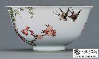 2006年11月,著名收藏家張宗憲先生收藏的清乾隆御制琺瑯彩杏林春燕圖碗,在香港由佳士德拍賣公司拍賣,約以1.51億港元成交。此碗琺瑯彩繪杏林春燕圖,弱柳扶風(fēng),杏花盛開,雙燕飛翔其間,一側(cè)行楷御題詩:“玉剪穿花過,霓裳帶月歸”。造型秀美,白釉溫潤,底為雙方框“乾隆年制”藍料款。工藝精湛,為乾隆琺瑯彩杰作。1985年5月此碗曾在香港蘇富比上拍,成交價為110萬港幣,短短二十年的時間,價格就翻了130多倍。