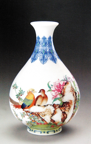 說起“鎮(zhèn)館之寶”,就不能不說“清乾隆款琺瑯彩芍藥雉雞紋玉壺春瓶”。日前,記者在天津博物館精品館內(nèi)看到了這只單獨(dú)放置在玻璃罩內(nèi)的“玉壺春瓶”。這只價(jià)值連城的瓷瓶?jī)H有一掌之高,質(zhì)地瑩白溫潤(rùn),瓶身繪有雉雞、湖石和盛開的芍藥,并有墨書題詩(shī),造型古樸,紋飾精美,是詩(shī)、書、畫合璧的彩瓷藝術(shù)珍品,也是瓷器收藏中的極品。