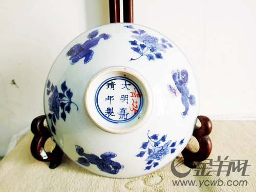 該碗底款雖是”大明嘉靖年制”,卻具有典型的清初風(fēng)格。首先款識(shí)的字體和筆法幼細(xì)有力,是康熙的風(fēng)格。這種底款叫”寄托款”,即明清一些瓷器中不題寫(xiě)本朝代的年款或堂名款而題寫(xiě)前一朝或幾朝的款識(shí),稱之寄托款。清初
