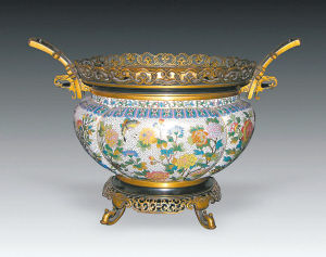 根據(jù)胎地的不同,琺瑯器一般可以分為金胎琺瑯、銅胎琺瑯、瓷胎琺瑯、玻璃胎琺瑯、紫砂胎琺瑯等,而最為常見的是金屬胎琺瑯器。其中銅胎琺瑯因為銅料與表面琺瑯容易結(jié)合,且銅料價格相對容易接受,因此銅胎琺瑯最為廣泛。金屬胎琺瑯器依據(jù)具體加工工藝的不同,又可分為掐絲琺瑯器、鏨胎琺瑯器、畫琺瑯器和透明琺瑯器等幾個品種。掐絲琺瑯器在國內(nèi)出現(xiàn)比較早,歷史記載可追溯到宋元時期,在明景泰和成化兩朝最為常見,即是俗稱的“景泰藍(lán)”。
