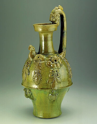 這件陶壺外表施釉,釉色綠中泛黃、晶亮瑩潤,但它并非瓷器,而是為隨葬燒制的施釉陶器。釉陶在漢代比較流行,以後少見。