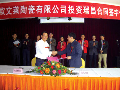 11月21日上午,在佛山陶瓷行業(yè)協(xié)會(huì)秘書(shū)長(zhǎng)尹虹等人的見(jiàn)證下,佛山歐文萊陶瓷董事長(zhǎng)梁偉鴻與江西省九江瑞昌市政府簽訂了一份投資金額達(dá)10個(gè)億的協(xié)議,確定在瑞昌市碼頭工業(yè)區(qū)新型建材工業(yè)基地圈地1080畝,并規(guī)劃上12條生產(chǎn)線,成為落戶該基地的第一家企業(yè)。作為江西省繼高安、豐城、景德鎮(zhèn)等幾家在建陶瓷基地之后的又一個(gè)新辟陶瓷基地,瑞昌市也開(kāi)始進(jìn)入佛山陶企外遷的視線中來(lái)。