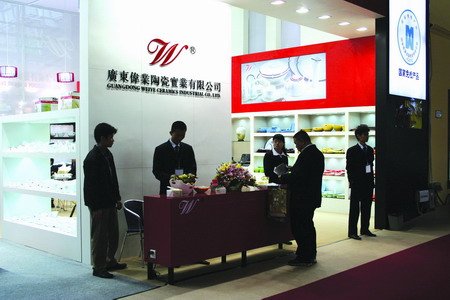 高檔日用強(qiáng)化瓷和高檔骨質(zhì)瓷是廣東偉業(yè)公司的拳頭產(chǎn)品,也是國內(nèi)同類型產(chǎn)品中質(zhì)量最好的產(chǎn)品之一,一直暢銷于海外,公司有多套瓷具曾囊括中國陶瓷產(chǎn)品設(shè)計(jì)大賽金銀銅獎(jiǎng)。在印有清綠蓮蓬圖案的紗帳環(huán)繞下,展廳里那些白如雪、細(xì)如絲、明如鏡的楓溪瓷讓人大開眼界,瓷具的色澤光感、款式造型,無不給人以視覺的享受。廳前擺置的茶水糖果,為“偉業(yè)”的親和力加分不少。