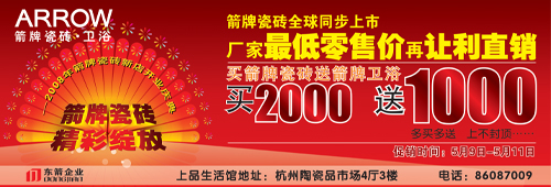 為喜迎東箭箭牌瓷磚上品生活館啟動(dòng),廠家讓利直銷,在5月9日—5月11日三天,所有客戶在最低零售價(jià)基礎(chǔ)上,買箭牌瓷磚送箭牌衛(wèi)浴,買2000送1000,多買多送,上不封頂,瘋狂搶購(gòu),僅限三天! 且在5月9日開業(yè)當(dāng)天,箭牌衛(wèi)浴為支持箭牌瓷磚的上市,演繹兄弟之情,傾情推出箭牌衛(wèi)浴愛(ài)心拍賣會(huì),即在上品生活館廣場(chǎng)進(jìn)行多款座廁的拍賣,起拍價(jià)50元\個(gè)起,拍賣的款項(xiàng)全部捐贈(zèng)給社會(huì)上需要幫助的人.