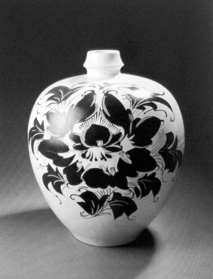 第二部分:黑白交織的磁州窯。黑與白的色彩對比和豐富多彩的裝飾手法,造型和裝飾無不洋溢著濃郁的民間風(fēng)情和鄉(xiāng)土氣息。展品共18件,件件都是磁州窯精品,其中劉立中的蘆雁紋扁壺、白地黑花牡丹紋大圓瓶更是匠心獨(dú)具。