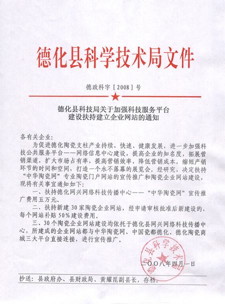 2008-4-2近日,德化縣科技局決定,將通過“德化網(wǎng)興網(wǎng)絡(luò)科技傳播中心”扶持建立30家德化陶瓷企業(yè)網(wǎng)站,德化科技局將補(bǔ)貼50%的網(wǎng)站建設(shè)費(fèi)用,企業(yè)自費(fèi)50%,以帶動(dòng)企業(yè)上網(wǎng),建立新的營(yíng)銷渠道,擴(kuò)大市場(chǎng)占有率。
