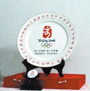 昨天中午記者來到市民孫云中家中時,首先映入眼簾的便是擺放在客廳茶幾上、用紅木托架起的這枚白色瓷碟。記者看到,直徑30厘米大的白色瓷碟上刻滿了北京奧運會的代表標志。瓷碟正面不到4厘米的外沿上,精細地刻著35個紅色的奧運項目標志圖。翻過瓷碟,其背面更是精彩,瓷碟背面用優(yōu)雅的美術(shù)字刻著“北京歡迎你”及五個活靈活現(xiàn)的奧運福娃形象,在五個福娃的身上,分別有五個不同字體的“福”字。
