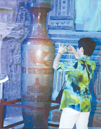 這個高2.2米,朱色的坭興陶大花瓶,名字叫“世博緣·壯鄉(xiāng)情”。場館負(fù)責(zé)人告訴記者,這是目前世界上最高的坭興陶花瓶,是廣西為世博量身訂造的一件展品。傳統(tǒng)的瓶形上,繪有豐富的世博元素和廣西元素。世博園中國館造型、世博吉祥物海寶的形象、世博會的會徽和廣西的山水、第四屆中國東盟博覽會會址廣西南寧國際會展中心等,交相呼應(yīng)了瓶身上刻著的“城市,讓生活更美好”和“綠色家園·藍(lán)色夢想”的兩個主題,表達(dá)了壯鄉(xiāng)人民迎世博、參與世博的真摯情感,也引起了不少游客的關(guān)注。