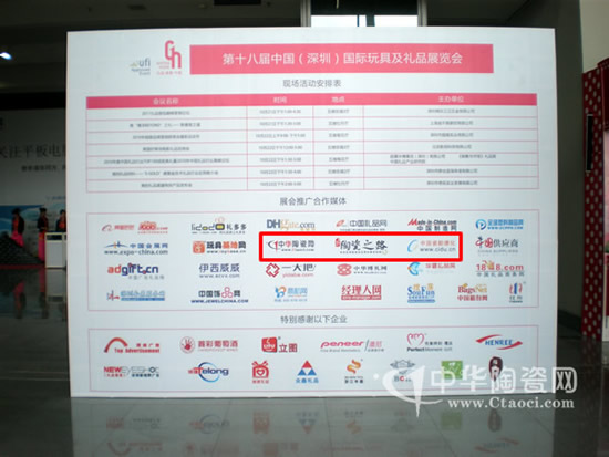 2010年10月21日-24日,由勵(lì)展華博主辦的國內(nèi)禮品第一大展,第十八屆中國(深圳)國際玩具及禮品展覽會(huì)在深圳會(huì)中心1-9號(hào)館隆重舉辦,來至國內(nèi)陶瓷行業(yè)第一門戶中華陶瓷網(wǎng)及旗下《陶瓷之路》中國瓷都德化網(wǎng)連系6屆以合作媒體身份參加展會(huì)。展會(huì)上中華陶瓷網(wǎng)攜帶部份客戶產(chǎn)品直接展示在全國客商面前,精美的陶瓷之路雜志更吸引了重多客商索閱,中華陶瓷網(wǎng)以網(wǎng)絡(luò)、平面、展會(huì)、線上線下b2c等多種模式結(jié)合,為陶瓷企業(yè)及客商建立了強(qiáng)勁的供應(yīng)鏈,對(duì)企業(yè)品牌推廣起到顯著效果。