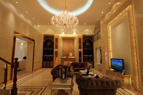 裝修上我們用的是也是高標(biāo)準(zhǔn),用磚上我們用到了很多深加工的工藝,像大廳地面大型的拼花;墻面上的倒角、雕刻裝飾;門套上的立體鋪貼;鎦空的背景墻等都是很精致的。另外我們也用到了很多瓷磚和其它材質(zhì)配合的嘗試,比如茶鏡、金屬、木線、壁紙、皮毛的搭配裝飾,在細(xì)節(jié)上做得既金碧輝煌的華麗而不會空洞俗氣。你可以看到我們用的家具、燈飾也是配合得很好的,整體就是一個現(xiàn)代歐式的別墅。