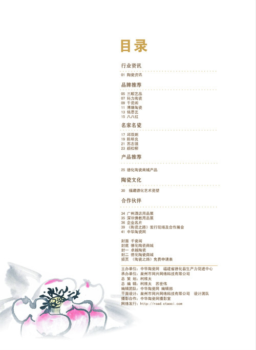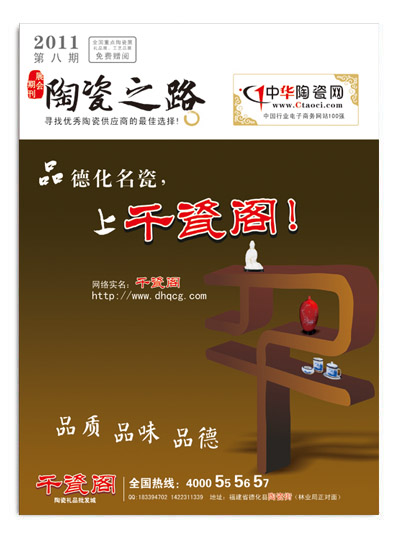 本期《陶瓷之路》總頁數(shù)共有52頁,收錄30多家陶瓷企業(yè)信息。雜志將重點(diǎn)在2011成都家居、休閑用品及禮品展覽會【2011年6月17日—19日】、2011第九屆廣州國際酒店設(shè)備及用品展覽會【2011年6月30日~7月2日】、中國北京國際禮品、贈品及家庭用品展覽會【2011年8月17-20日】等展覽會上發(fā)行。目前雜志每期發(fā)行約10000本,50通過展會現(xiàn)場派發(fā)給客商、40%通過郵寄免費(fèi)贈閱給行業(yè)客商10%通過上門或客商來電申請索閱,如您經(jīng)常采購陶瓷,也可聯(lián)系我們,將免費(fèi)長期獲取精美《陶瓷之路》,聯(lián)系電話:0595-23555005。