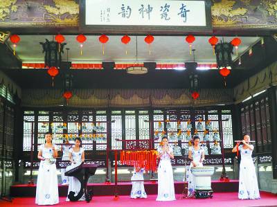 來到古窯,千萬不能錯過的,就是青花瓷樂隊的演出。舞臺設(shè)在湖面上,涼風(fēng)襲來,荷花飄香,身著青花瓷圖案長裙的美女樂手們魚貫而入,動聽的音樂悠然響起。這套瓷樂器包括瓷甌、瓷笛、瓷簫、瓷方響、瓷鼓、瓷管鐘、瓷編鐘、瓷胡琴等,充分體現(xiàn)了景德鎮(zhèn)瓷器“聲如磬”的特點,演奏出的樂曲優(yōu)美流暢,柔和婉轉(zhuǎn),精致細膩,回味無窮。