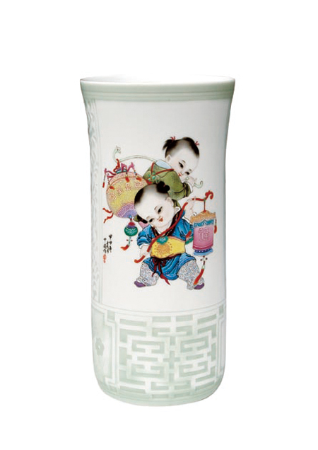 及至今日,在傳承先輩們優(yōu)良傳統(tǒng)的基礎(chǔ)上,不少瓷畫藝人開拓創(chuàng)新,在傳統(tǒng)技法的基礎(chǔ)上融一些現(xiàn)代元素,將孩童置于田間地頭,鄉(xiāng)野幽林……這些喜聞樂見的農(nóng)村風(fēng)光中,更凸顯童稚可愛、淳樸天然的生活氣息。畫面中天真的孩童們或揚鞭打陀螺、或削竹乘車馬、或牽線放紙鳶、或下塘捉魚蝦……,孩童們個個光著腳丫,一任的奔跑和撒歡,無憂無慮。透過畫面我們聞到了花香,聽到了鳥叫和蟬鳴,更有孩子們的嬉笑打鬧。這些無不透露出濃郁的生活氣息和深厚的人文底蘊。