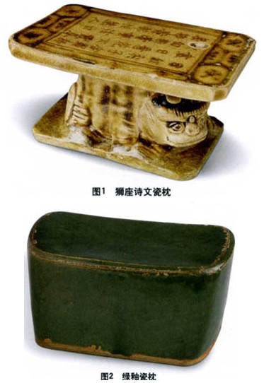 在北京首都博物館開(kāi)幕的中國(guó)記憶——五千年文明瑰寶展中有一件唐代長(zhǎng)沙窯褐綠彩繪獅座詩(shī)文瓷枕(圖1)非常引人注目,它造型別致、裝飾精美、器形小巧,為長(zhǎng)沙窯瓷枕中之極品。高7.3、長(zhǎng)13.1、寬8.1厘米。青釉、灰白胎,枕面與底座均為長(zhǎng)方形,中一臥獅承托枕面。枕面為長(zhǎng)方八角,兩端是褐綠彩六邊幾何圖案裝飾,中間部分用褐彩書寫七言絕句一首:“日紅衫子合羅裙,盡日看花不厭春。欲向窗臺(tái)重注口,無(wú)那蕭郎惱煞人。”枕頭是人們生活中的必需品,它能使人們?cè)诰蛯嫊r(shí)頭部舒適、從而使大腦得到更好的休息。南方夏季天氣炎熱,高溫持續(xù)時(shí)間長(zhǎng),寢具以涼爽為宜。于是季節(jié)性商品瓷枕就出現(xiàn)于人們的生活之中。在一件宋代瓷枕上有這樣的詩(shī)句為證:“久夏天難暮,紗幮正午時(shí),忘機(jī)堪晝夜,一枕最幽宜。”