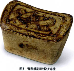 據(jù)不完全統(tǒng)計(jì),現(xiàn)已發(fā)現(xiàn)長(zhǎng)沙窯瓷枕百余件,保存完整的僅有數(shù)十件,它們主要是長(zhǎng)沙窯窯址、湖南地區(qū)以及揚(yáng)州、寧波等地唐五代墓葬或遺址出土。這些瓷枕的裝飾題材和裝飾手法相當(dāng)豐富,從彩釉上看,褐綠彩呈色純正鮮艷,青、白、黃、綠等顏色釉齊全。如湖南省博物館收藏的綠釉瓷枕(圖2),釉質(zhì)勻潤(rùn)、釉色純正,為顏色釉的代表之作。長(zhǎng)沙窯瓷枕的裝飾手法有繪畫、印花、刻劃等多種,裝飾題材不拘一格,畫面很少雷同,詩(shī)詞、寫意畫耐人尋味,飛禽走獸、植物等也活現(xiàn)于瓷枕之上。中國(guó)傳統(tǒng)繪畫講究團(tuán)團(tuán)圓圓,成雙成對(duì),長(zhǎng)沙窯瓷枕裝飾也不例外,如瓷枕(圖3)上所繪比翼雙飛的雀鳥(niǎo),前面一只回首顧盼,后面一只緊緊跟隨,兩雀雙目傳情,畫面栩栩如生。由于瓷枕是季節(jié)性商品,故在裝飾上反映季節(jié)性內(nèi)容也較多,有盛開(kāi)的蓮花、有蘆叢中的水鳥(niǎo),特別是湖南省博物館收藏有兩件長(zhǎng)沙窯五代的紀(jì)年瓷枕,一件是“開(kāi)平三年—夏月二女使用”,另一件“貞明六年”瓷枕的胎上刻劃的時(shí)間是“五月十五”,而枕面用褐彩書寫的時(shí)間卻為“六月六日”,很顯然,底款是在瓷枕坯胎未干時(shí)刻劃上去的,五六月正是南方的盛夏季節(jié),也是瓷枕銷路最好的時(shí)段。