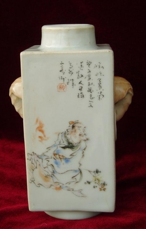王琦 (1886--1933)為“珠山八友”之首,字碧珍,別號(hào)陶迷道人。祖籍安徽,后遷居江西新建縣。王琦幼年曾讀私塾,酷愛繪畫。父親是販鹽船戶,曾隨父在水上生活。王琦擺脫了錢的影響,轉(zhuǎn)師為乾隆間的“揚(yáng)州八怪”的黃慎。模仿黃慎寫意法畫衣紋,線條自由生動(dòng),運(yùn)用粉彩畫人物臉面、有立體感、富有新意。王琦用筆豪放、富于變化,所繪花鳥魚蟲各具特色。