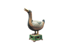 李一平介紹,該器模制,分上下兩截。鴨頸中空與口相通,腹部合縫處子口上勻布六個隱孔,空氣可從隱孔進(jìn)入腹內(nèi),并與張的鴨嘴對流。它比將對流孔設(shè)在鴨背的東周曾侯乙墓鴨形香盒、宋銅器鴨熏、宋影青釉瓷鴨熏更為巧妙美觀。