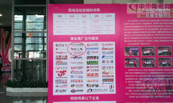 中華陶瓷網(wǎng)至2008年以來(lái),先后成為全國(guó)600多個(gè)主要陶瓷展、禮品展、工藝品展會(huì)合作媒體,先后參加全國(guó)五十多場(chǎng)展會(huì),如2008年\2009中國(guó)廣州國(guó)際陶瓷展、中韓陶藝家作品交流展暨中韓陶藝交流系列活動(dòng)、中國(guó)(海絲)工藝品博覽會(huì)、第三、四、五、六、七、八屆海峽工藝品博覽會(huì)、全國(guó)最大禮品展——十六、十七、十八、十九、二十、二十一屆(春伙共計(jì)11屆)深圳禮品展、第六屆廈門(mén)禮品展、第八、九、十、十一屆北京禮品展、第五屆中國(guó)海峽電子商務(wù)博覽會(huì)、第四屆中小企業(yè)電子商務(wù)應(yīng)用發(fā)展大會(huì)、景德鎮(zhèn)瓷博會(huì)、第十五屆中國(guó)(佛山)國(guó)際陶瓷及衛(wèi)浴博覽交易會(huì)等,還多次舉辦各種活動(dòng),如中國(guó)瓷都德化(廣州)名瓷展等活動(dòng)。網(wǎng)站被全國(guó)多家網(wǎng)絡(luò)、報(bào)紙、雜志、電視臺(tái)等媒體報(bào)道。網(wǎng)站還在德化、景德鎮(zhèn)開(kāi)通戶(hù)外廣告,登上全國(guó)600多本展會(huì)會(huì)刊、《福建省電子商務(wù)》雜志等。