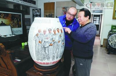 5月6日,中國陶瓷藝術(shù)大師閆先公(右)正在欣賞刻瓷作品《中國近現(xiàn)代十六位國畫大家》。當(dāng)日,由70歲的山東省淄博市淄川區(qū)文化藝術(shù)館原館長閆先公,歷時(shí)半年創(chuàng)作的大型刻瓷作品《中國近現(xiàn)代十六位國畫大家》揭開面紗。此瓶為白瓷,高80厘米、最大直徑63厘米、瓶口42厘米。作者利用刻瓷獨(dú)有的藝術(shù)手法,展現(xiàn)了齊白石、吳昌碩、黃賓虹、徐悲鴻