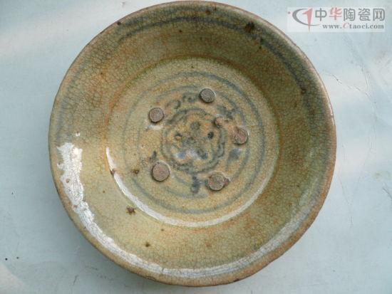 石廠窯青瓷胎土有白、灰白、灰黃等,均使用一種本地叫“觀音土”的瓷土,只是陶洗的精細(xì)程度不同而已。石廠瓷釉色有青黃、青灰、青綠數(shù)種,另有少量黑瓷。器型以碗為大宗,另有各型折腰盤(pán)、高足杯、茶臼等。青瓷釉色又有兩種,一種顏色偏綠,呈玻璃光澤,與中原青瓷相比毫不遜色,另一種顏色偏灰,亞光(圖1、2、3)。青瓷以素面為主,但部分碗底有印花裝飾。石廠窯使用龍窯燒制,慢輪手工拉坯,碗盤(pán)之間使用泥丸支燒,青瓷、黑瓷同窯燒制。