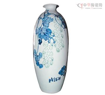 《碩果累累》花瓶器型:撇口,短頸,溜肩,肩以下漸收。運(yùn)用青花汾水與半刀泥綜合裝飾技法,增強(qiáng)了作品的整體美。主體畫(huà)面采用青花汾水技法,表現(xiàn)出枝葉的濃淡,正反與層次。在果實(shí)部分則用半刀泥技法,刻出果形,施以數(shù)層青釉,形成凹凸的立體感,使清香四溢像一串串綠寶石一樣的葡萄形象逼真、惟妙惟肖。整件作品,青白空間處理相宜,疏密之間安排有致,汾水層次豐富,明暗濃度變化自然。展現(xiàn)出一副春華秋實(shí)、果滿枝頭的絢麗景色!
