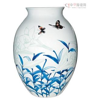 《百年好合》花瓶器型:撇口、溜肩、圓腹。采用半刀泥的裝飾技法突出百合花純潔、天真的形態(tài)。每莖一花,隱隱幽香。以青花勾繪出的葉莖形象簡(jiǎn)練,線條剛勁有力,枝葉飄動(dòng),畫(huà)面無(wú)風(fēng),卻有輕風(fēng)拂面之感。三只蝴蝶用粉彩表現(xiàn)得栩栩如生。整體畫(huà)面淡雅清新,構(gòu)圖嚴(yán)謹(jǐn),將百年好合的寓意表現(xiàn)得極為突出。
